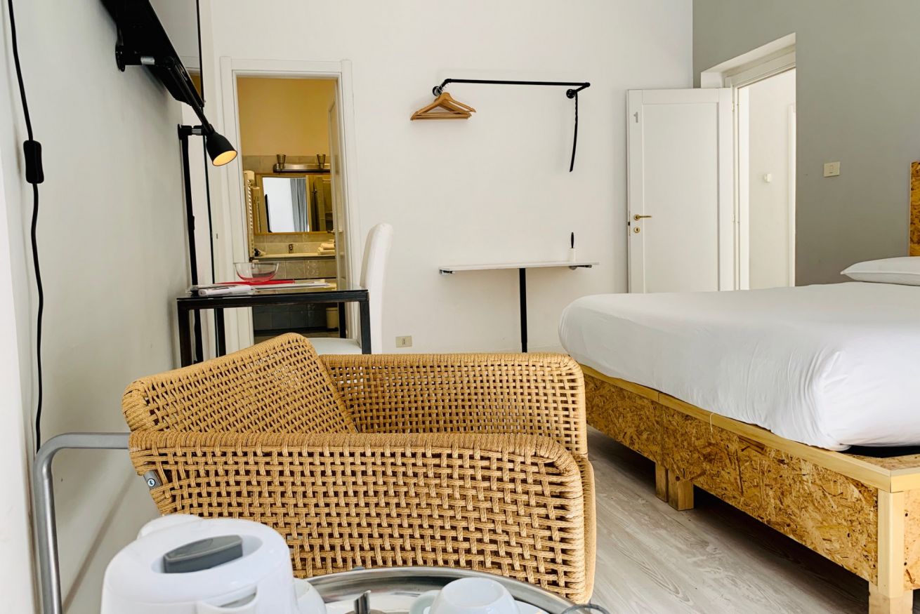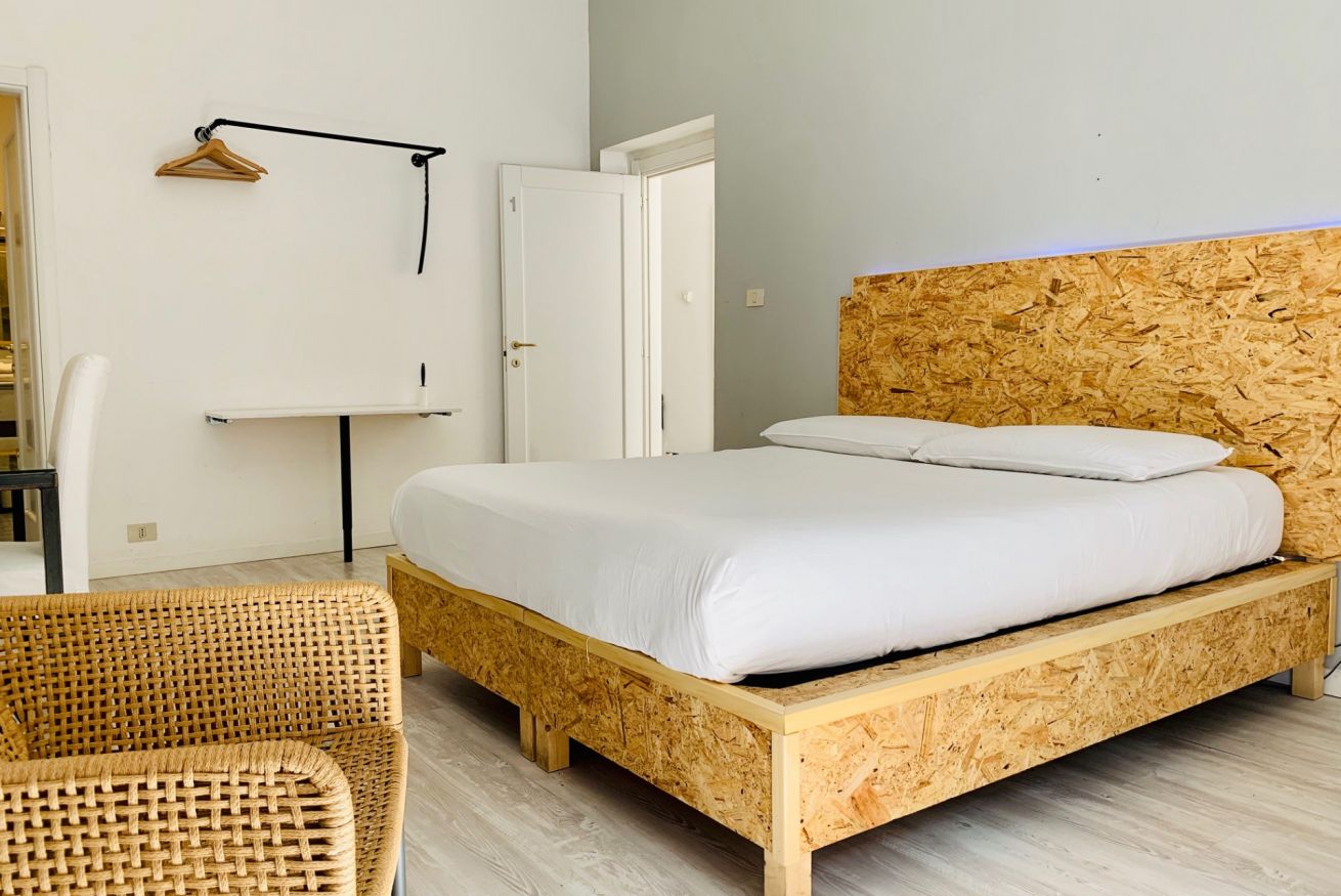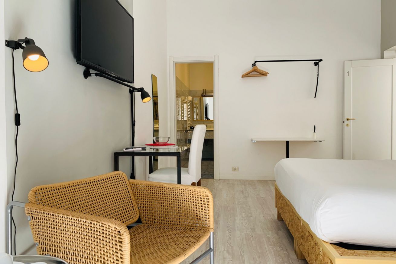 La camera Matrimoniale Deluxe con Terrazza è stato progettato per garantire il miglior comfort ai nostri ospiti.La camera è dotata di un ampia terrazza attrezzata con mobili da giardino e ombrellone, di un letto matrimoniale in legno riciclato con testiera retroilluminata con luci rgb e materasso in memory foam alto 25cm, un mobile con lavandino, minifrigo con congelatore e bollitore, una scrivania in stile industriale in vetro e ferro, una SmarTv da 42 pollici con Netflix e Primevideo gratuiti ed un ampio bagno con vasca ad immersione e bidet. La piccola zona in comune a disposizione è dotata di una macchina Nespresso, un bollitore, un frigorifero e un forno a microonde. Ai nostri ospiti offriamo gratuitamente caffè, tè e tisane da gustare. L’acqua che sgorga dai rubinetti è potabile.