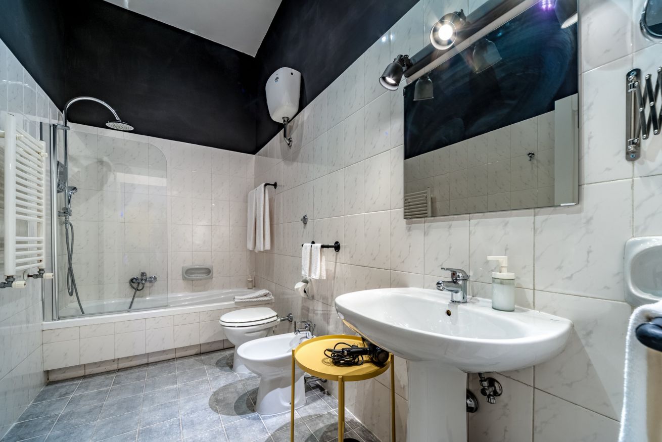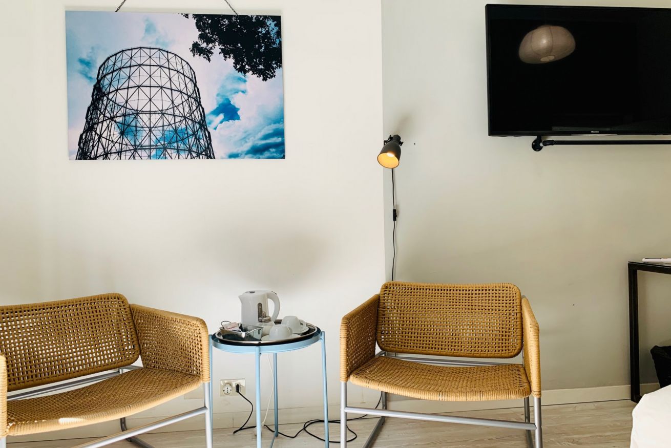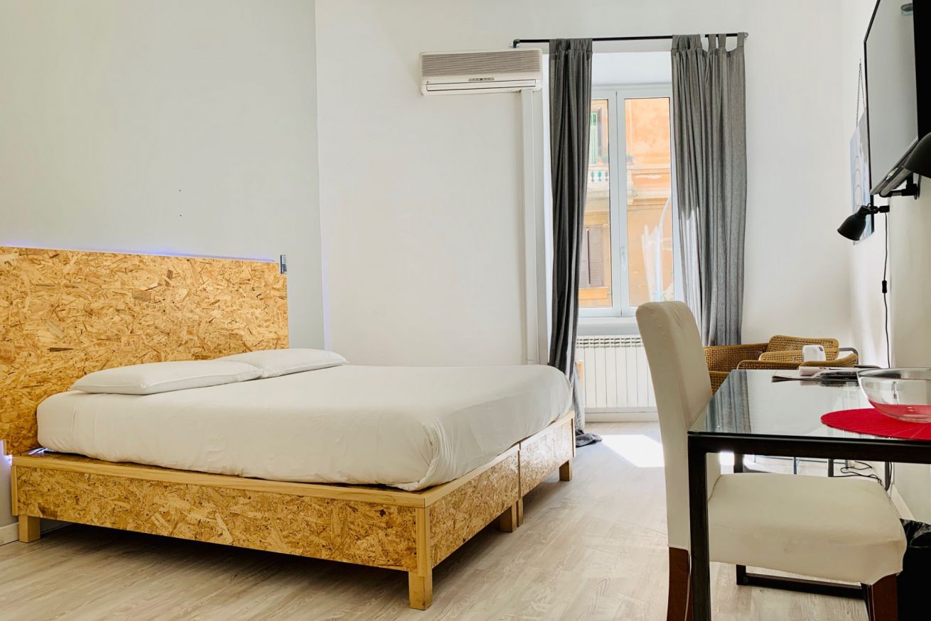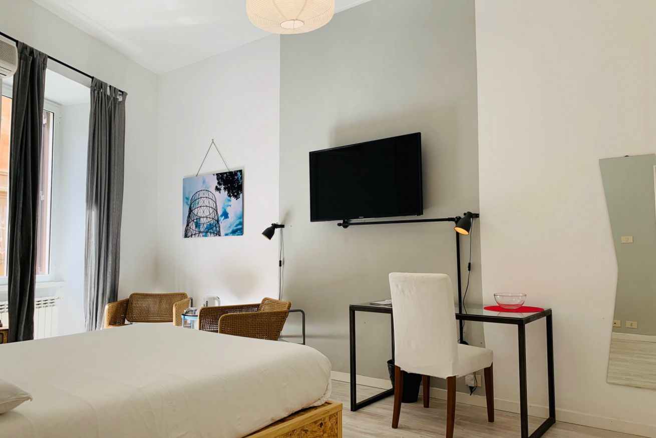 La camera Matrimoniale Deluxe con Terrazza è stato progettato per garantire il miglior comfort ai nostri ospiti.La camera è dotata di un ampia terrazza attrezzata con mobili da giardino e ombrellone, di un letto matrimoniale in legno riciclato con testiera retroilluminata con luci rgb e materasso in memory foam alto 25cm, un mobile con lavandino, minifrigo con congelatore e bollitore, una scrivania in stile industriale in vetro e ferro, una SmarTv da 42 pollici con Netflix e Primevideo gratuiti ed un ampio bagno con vasca ad immersione e bidet. La piccola zona in comune a disposizione è dotata di una macchina Nespresso, un bollitore, un frigorifero e un forno a microonde. Ai nostri ospiti offriamo gratuitamente caffè, tè e tisane da gustare. L’acqua che sgorga dai rubinetti è potabile.