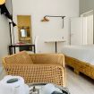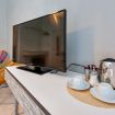 La camera Matrimoniale Deluxe è stata progettata per garantire il miglior comfort ai nostri ospiti.La camera è molto spaziosa, dotata di un letto matrimoniale in legno riciclato con testiera retroilluminata con luci rgb e materasso in memory foam alto 25cm, 2 poltrone in rattan, una scrivania molto ampia in stile industriale in vetro e ferro, Smart Tv da 48 pollici con Netflix gratuito, un ampio bagno con il doppio lavabo, doccia, bidet e wifi gratuito.La piccola zona in comune a disposizione è dotata di una macchina Nespresso, un bollitore, un frigorifero e un forno a microonde. Ai nostri ospiti offriamo gratuitamente caffè, tè e tisane da gustare. L’acqua che sgorga dai rubinetti è potabile.
